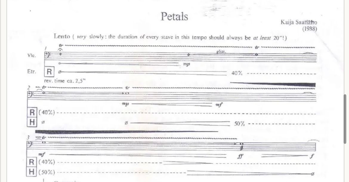When I first heard the opening passage of Kaija Saariaho’s Petals, it felt like someone had flipped a switch. The shimmering trill of a cello, slowly building in intensity, transformed the still air of my music classroom into a powerful soundscape far beyond my comprehension. At seventeen, I was familiar with the traditional repertoire—the instrument made me think of Bach’s Cello Suites or Elgar’s monumental Cello Concerto. But turning the pages of Saariaho’s score, I found that I had more questions than answers. Where was the key signature? Where were the bar lines? What did these arrows mean? What exactly was going on? The more I listened to the recording and looked at the notation, the more intrigued I became to discover the composer behind the work.